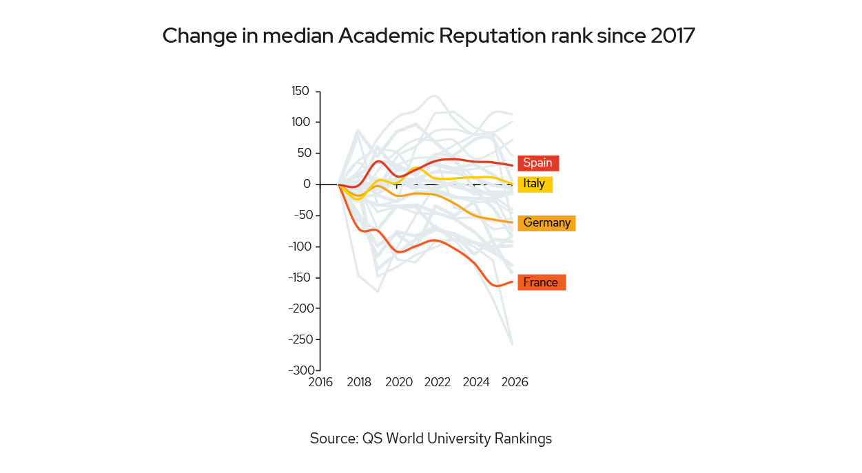 - Declining or plateauing reputation: France, Germany, Italy and Spain are all facing difficulties with their reputations among employers and academics. With students increasingly looking to reputation when making study decisions, future inbound flows may be damaged if institutional reputation does not improve.