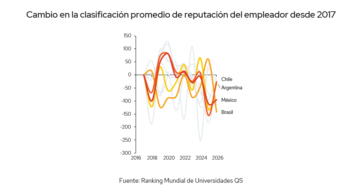 La reputación es un factor importante para los estudiantes - el 67% de los candidatos latinoamericanos y el 70% de los estadounidenses y canadienses la consideran importante al tomar decisiones de estudio. Sin embargo, las clasificaciones promedio de reputación de empleadores para las instituciones brasileñas y argentinas han disminuido drásticamente.
