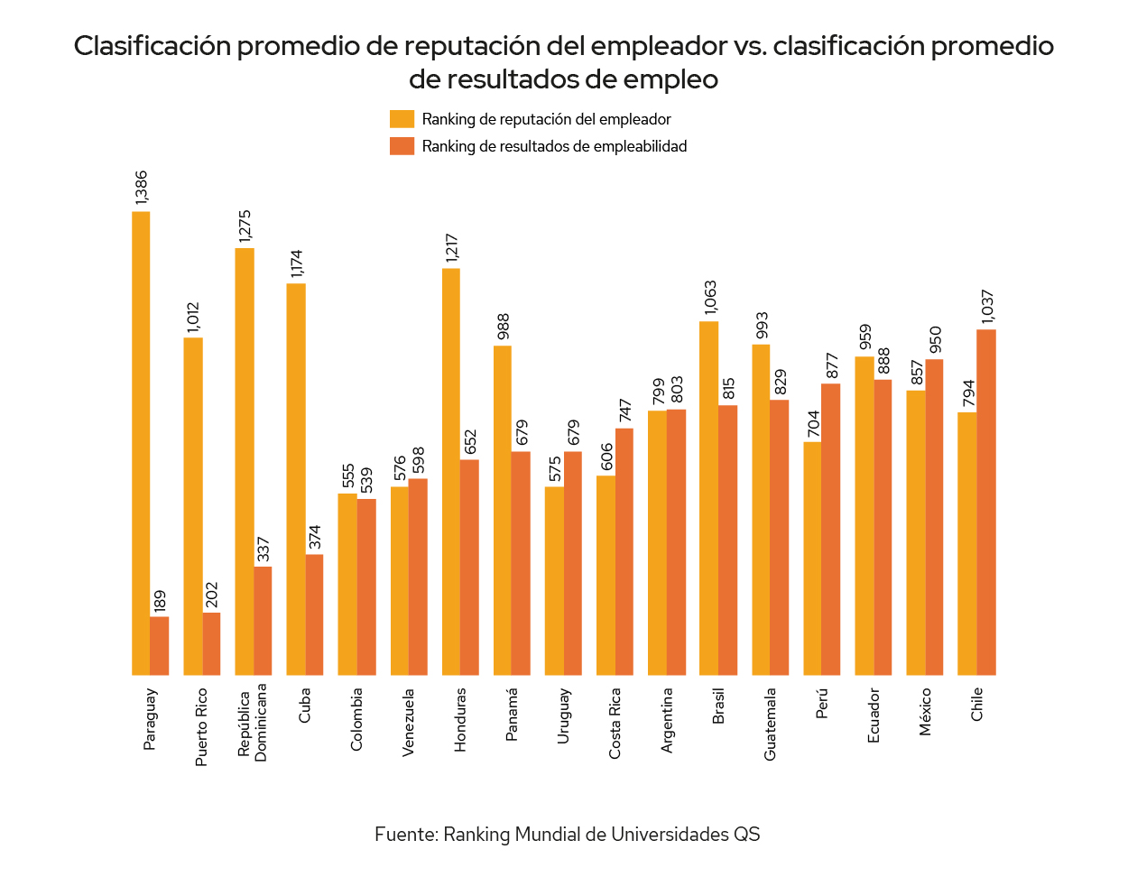 Al considerar los resultados de sus graduados, las instituciones deben tener en cuenta su reputación entre los empleadores, ya que la relación entre ambos es crucial. En muchos destinos latinoamericanos, las instituciones tienden a tener una clasificación más alta en resultados de egresados de lo que su reputación entre los empleadores sugeriría (Figura 18). Esta disparidad sugiere que, si bien las instituciones están brindando a los graduados las habilidades necesarias para ser contratados por los empleadores, no están aprovechando esos resultados positivos para mejorar su reputación global. Las instituciones deben considerar cómo crear una narrativa positiva entre sus empleadores utilizando las carteras de resultados de graduados y desarrollo de habilidades para lidiar con este desequilibrio. Garantizar que los graduados tengan la combinación adecuada de habilidades para seguir satisfaciendo las demandas de los empleadores debería ser un aspecto central del diseño de los planes de estudio futuros. Las instituciones pueden mejorar su reputación entre los empleadores al establecer esta narrativa desde el principio y, al hacerlo, pueden transformar su capacidad para convertirse en agentes de un mayor crecimiento económico en la región.