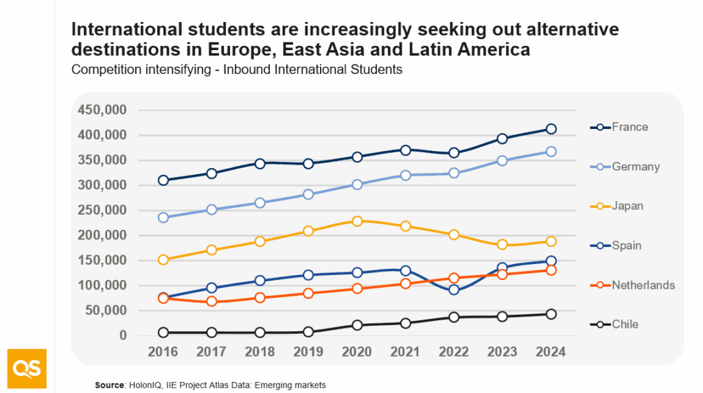 While the US has seen a loss of market share in the last 20 years, as new study destinations such as France, Germany, Singapore, Malaysia and China increase in attractiveness, it is likely to see competition for talented students ramp up further. The enrolment cliff projecting a 15% decline in US college students between 2025 and 2029 only exacerbates this further.