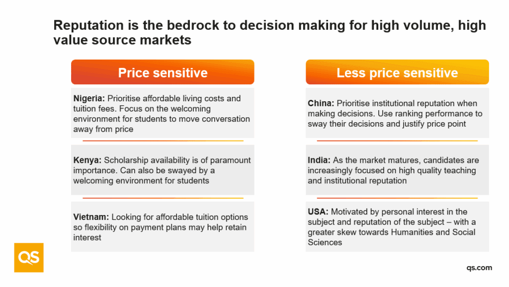 To reach new markets, universities need to be targeted in their positioning and messaging, focusing on affordable living costs and scholarships in some countries and institutional reputation and performance narratives in others.