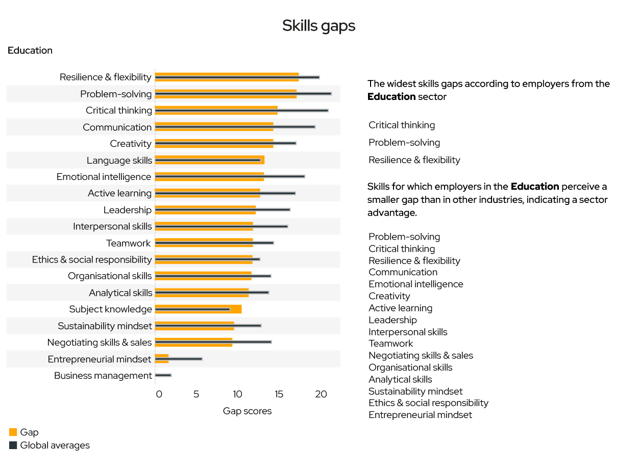 Employers also highlight gaps in resilience, flexibility, and adaptability, particularly in fast-moving sectors such as consulting, finance, government, education, manufacturing, and media. Modern work is defined by change, ambiguity, and continuous feedback, yet many employers feel graduates are underprepared for these conditions. In the education sector itself, resilience and flexibility appear among the widest reported gaps.