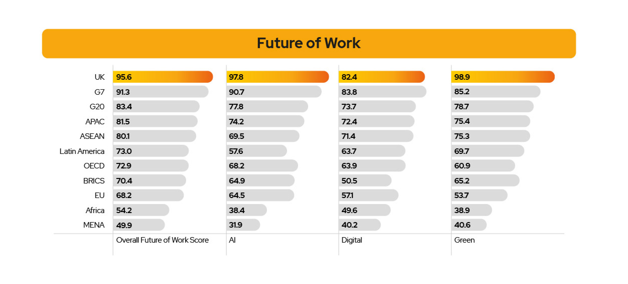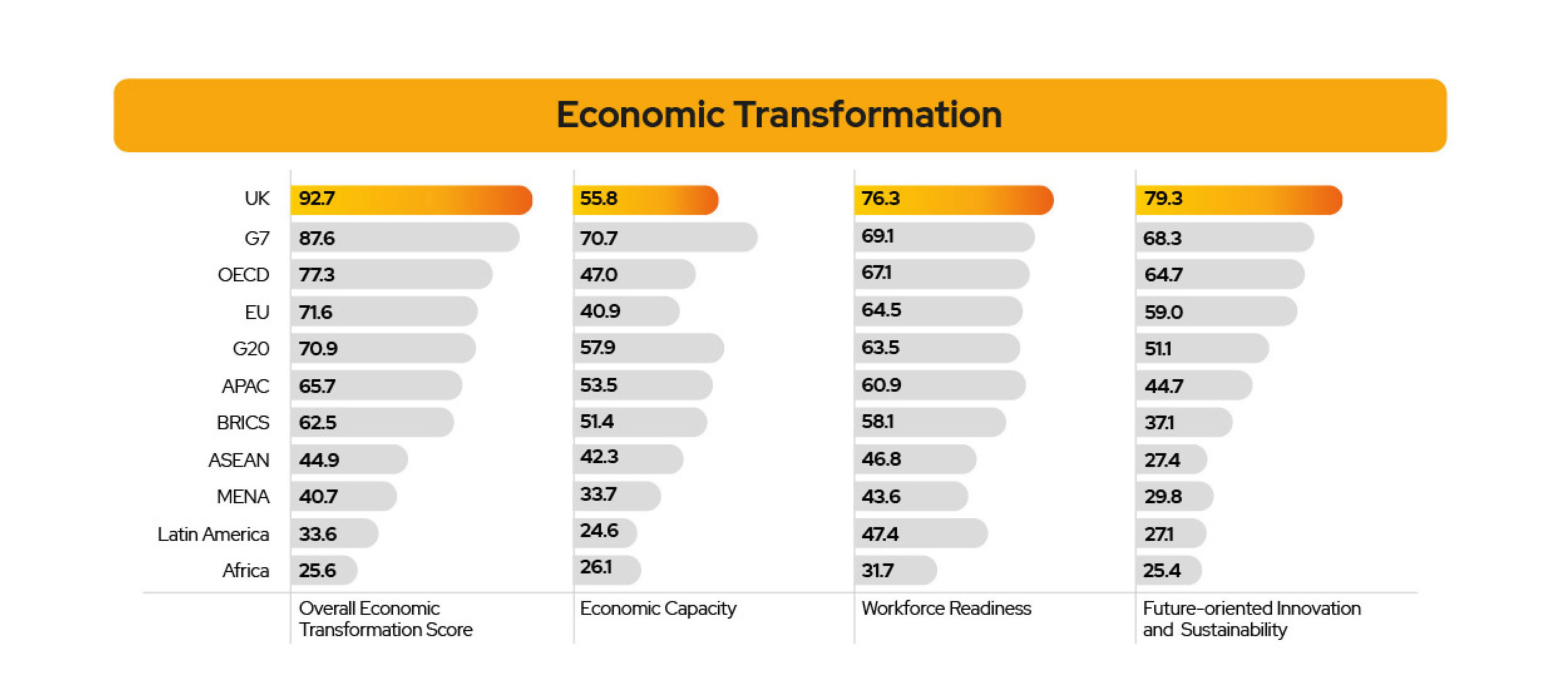 The UK places top in the world for two indicators - Skills Fit and Academic Readiness - and secures a perfect score, suggesting very strong higher education performance, and alignment with industry needs. However, the UK doesn't feature in the top five for either Future of Work or Economic Transformation.
