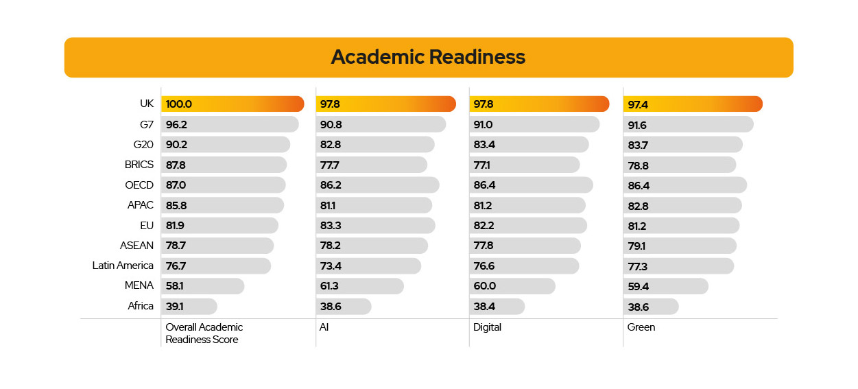 - Support the ability of education and industry to integrate future skills, innovate and ensure talent supply meets demand with funding, lifelong learning and upskilling opportunities: The UK government should support universities to develop new courses co-designed with industry – those programmes should focus on all future skills such as Green, AI and Digital. The UK already places above peer countries in the Academic Readiness for AI, Digital and Green skills. This strength must be maintained.