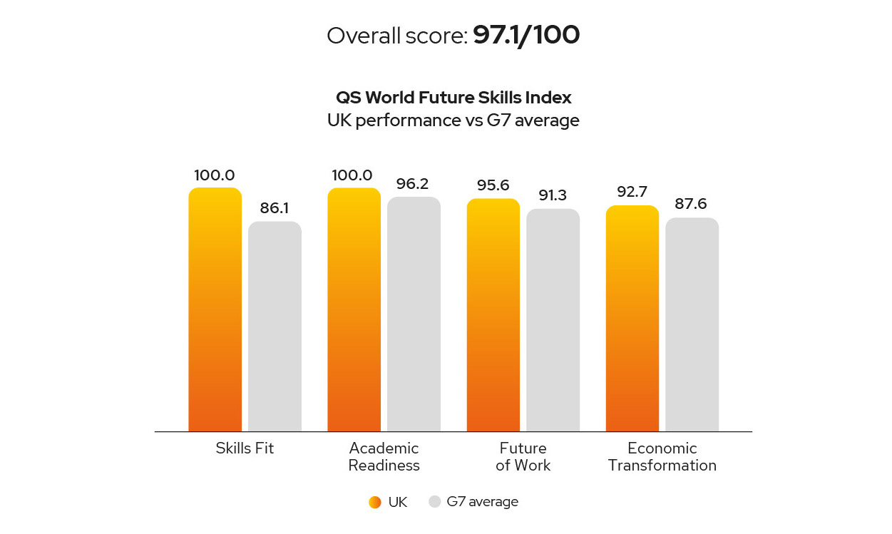 The UK’s education system preparing students for working in future industries, achieving top scores in AI, Digital, and Green skills. With over 100 universities ranked in the QS World University Rankings by Subject 2024, the UK sets the global benchmark for academic excellence and innovation. This strong foundation reflects its ability to align higher education with emerging economic demands. However, to maintain its leadership, the UK must evolve its curricula to stay ahead of global trends and further integrate sustainability, enhance interdisciplinary collaboration, and prioritise future-focused training